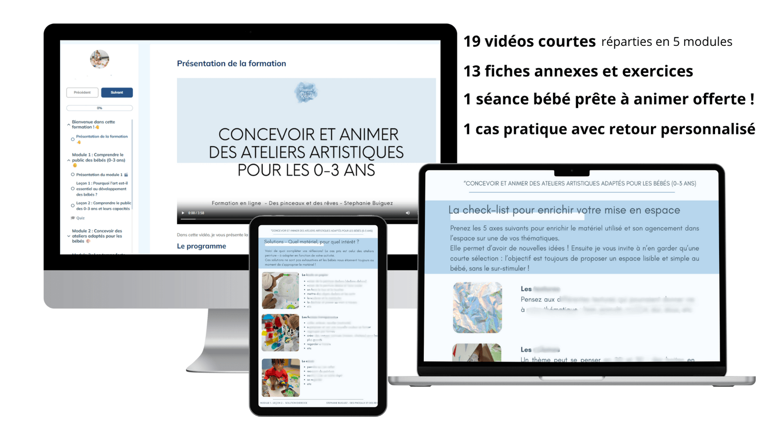 Les leçons sont des vidéos entre 15 et 30 minutes. Vous trouverez aussi des liens en annexes, ainsi que fiches exercices, fiches pratiques et quizz pour intégrer au fur et à mesure !